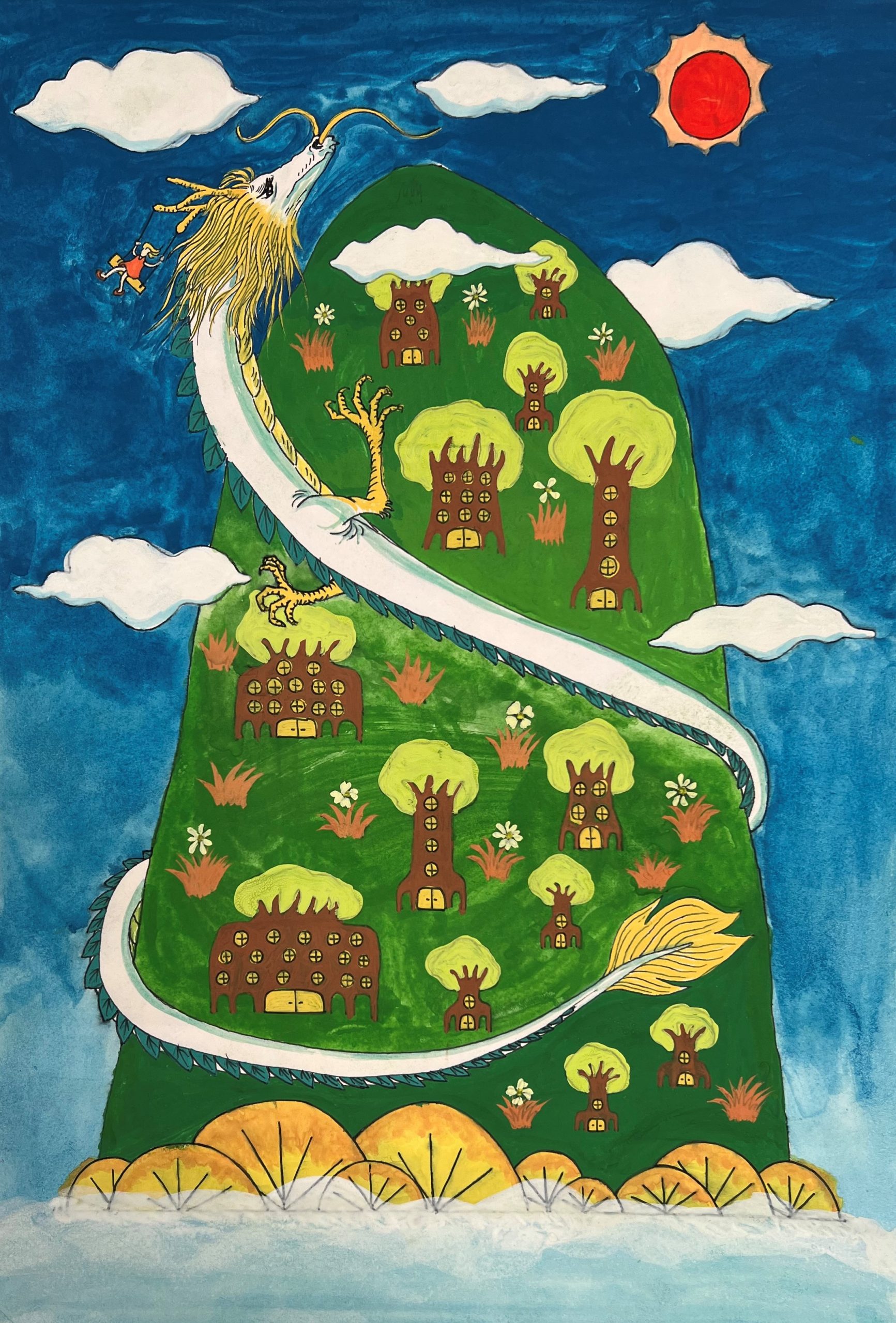 Description: My drawing shows harmony between man and nature in achieving sustainable development for the environment. In my drawing, we live amongst nature with homes, shops and factories built into trees. The air is pure and pollution is absent. A tree dragon acts as a "bridge" that connects humans and nature together, and reflects my intention for the artwork - which is to show harmony between man and nature. A little girl is swinging freely from the dragon's horns. One day, I hope to fly happily and freely into the big blue sky just like the little girl.