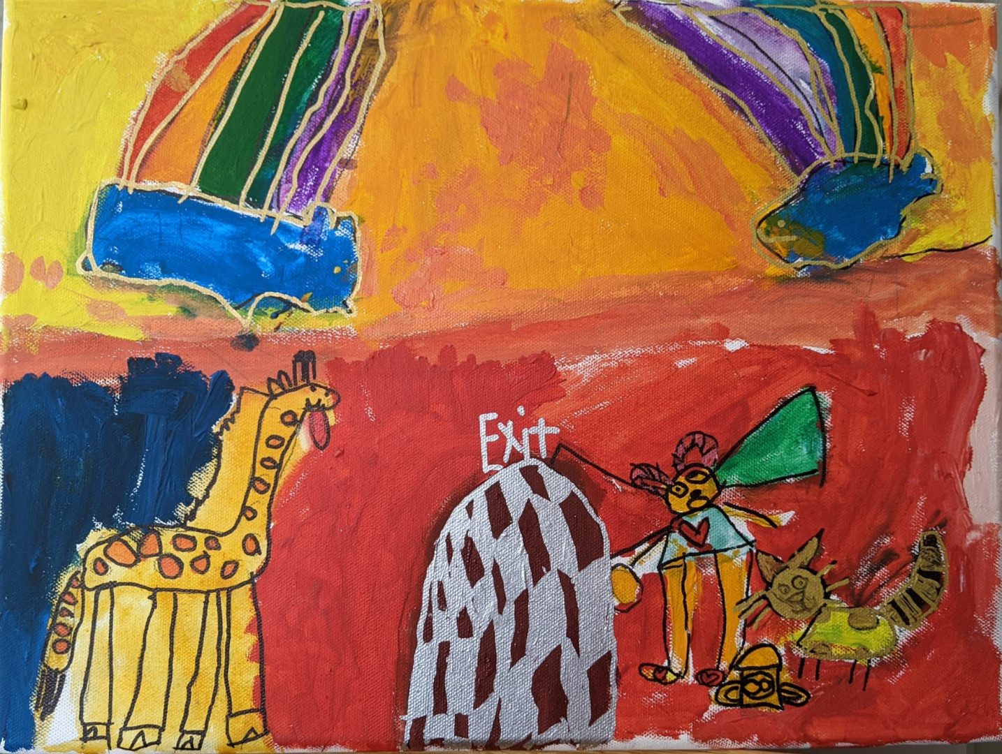 Description: Jill's dreamscape is an animal world - she has pictured herself with wings and a headband, and she has a pet golden cat in her dream. On the ground before her is her potato chip backpack. In the background is a rainbow with a golden outline, against a sunset. She sees a tall giraffe in her dream. A patterned silver door is the exit to her dream.