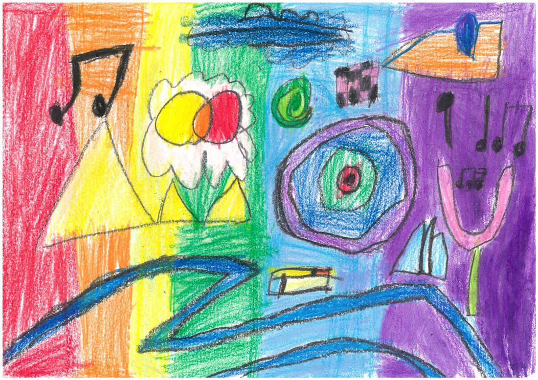 世界上有许多的声音,而声音是具有形状和符号。我用圆形、音符、线条、红橙绿蓝紫,描绘出我听见的声音,我绘画出花朵的声音,大山的声音,流水的声音,铃响的声音。