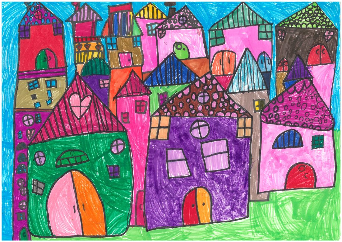 我画出了很多美丽的、暖暖的房子,送给世界上需要家的人们,让他们有房子住,这样就不害怕被雨淋了。