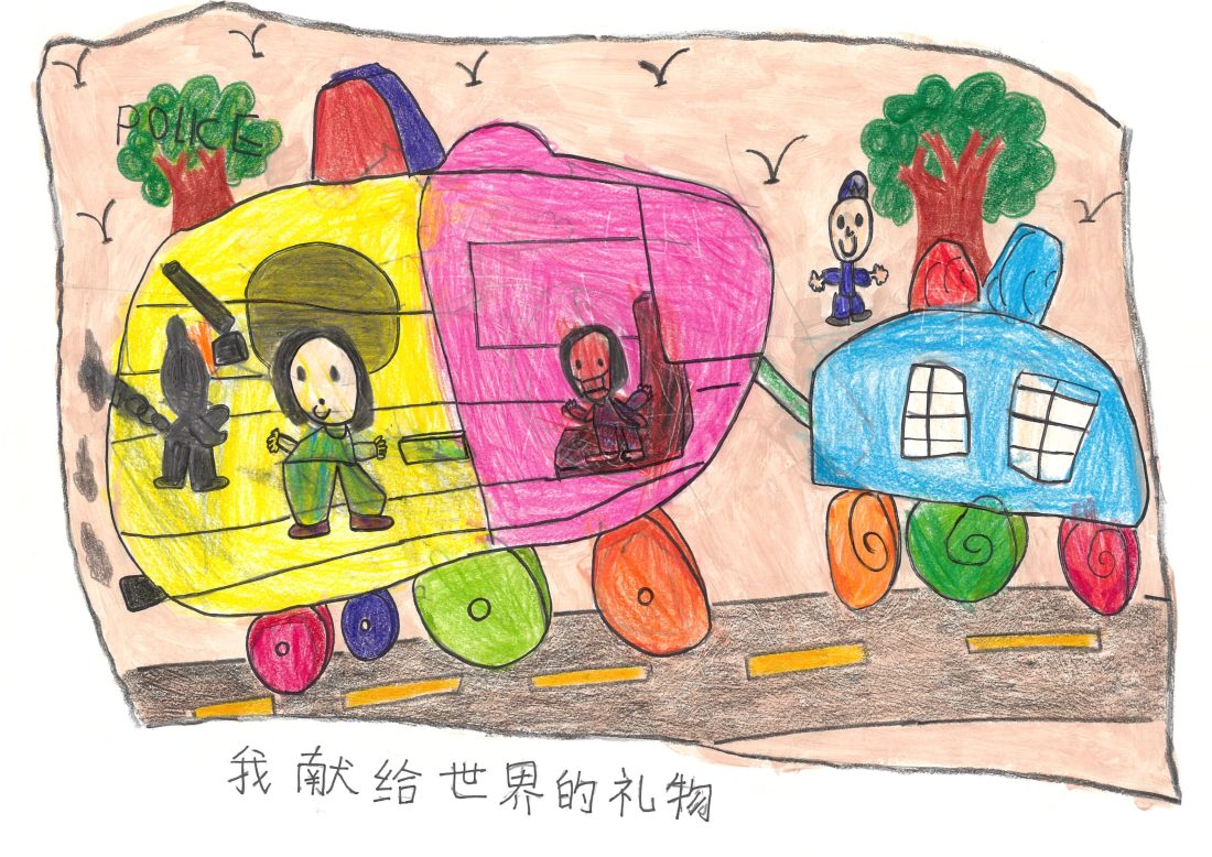 Description: 作品名称:《我献给世界的》 作者:莊汶凯 莊汶凯用稚嫩却坚定的笔触,描绘了他对未来的梦想——成为一名英勇的警察。他希望将来能保护世界的和平,把所有坏人都抓进“监狱学校”,让他们重新学习、重新做人,不再做坏事。 在他心中,真正的礼物不是物质,而是用正义和善良去改变世界。他相信,只要每个人都懂得悔改与成长,世界就能变得更安全、更和谐。 这幅作品是莊汶凯送给世界的一份承诺:用勇敢守护善良,用爱与教育唤醒迷失的心。这,就是他献给世界最特别、最有力量的礼物。