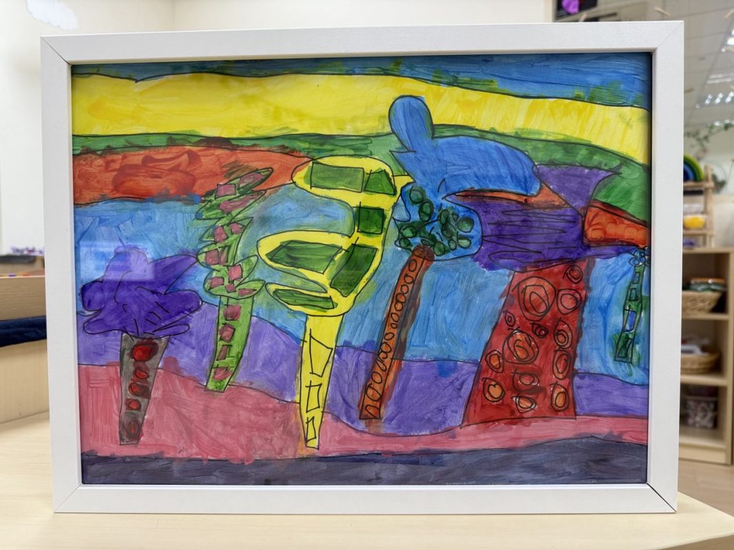 Description: This vibrant and imaginative artwork, created for the theme "My Gift to the World," beautifully conveys the child's wish for everyone to have trees around them (Share the gift of trees with everyone). Her bold, free-flowing lines and shapes captures the joy and life that trees bring to our world. Each tree is uniquely colored and textured, represents the importance of nature and remind us of the importance of caring for the environment. Through her art, she shares a simple yet powerful message: trees make the world beautiful, and she hopes everyone can enjoy them.
