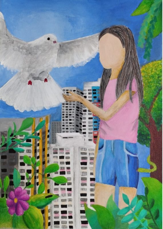 Description: This artwork represents the idea of giving back with care to our society. The girl is faceless as I wanted to encourage the viewers that everyone can give back in our own ways and with simple actions. The dove represents our contributions, whether big or small, they all make a lasting impact, on our society, on Mother Nature, on the world.