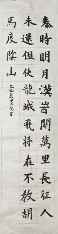本作品书写唐代诗人王昌龄的名篇《出塞》。诗句展现了古代将士守护家园、英勇无畏的精神。作品通过临写经典诗词,把这种忠诚与担当作为“我献给世界的礼物”传递出来。作品不仅是对中华传统文化的继承,也是希望全世界都能感受到和平与守护的重要意义。