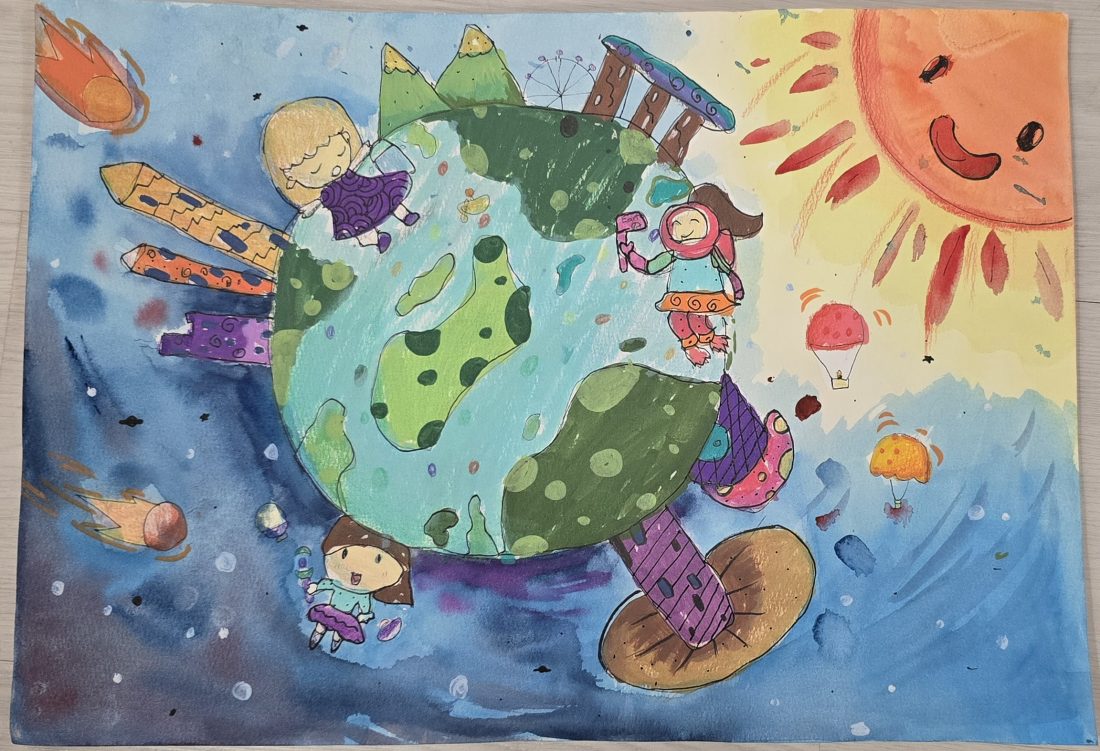 Description: Each Girl in the artwork represent 1 Theme mentioned below. 1.水源-有水的地方就有生命 Water is considered the essence of all living things. 2. To Guard to Protect- 守护这个世界,防止污染,战争。Protect this world from danger, pollution and war. 3. Support and Encourage one another for a better future- 互相扶持鼓励创造更好的未来