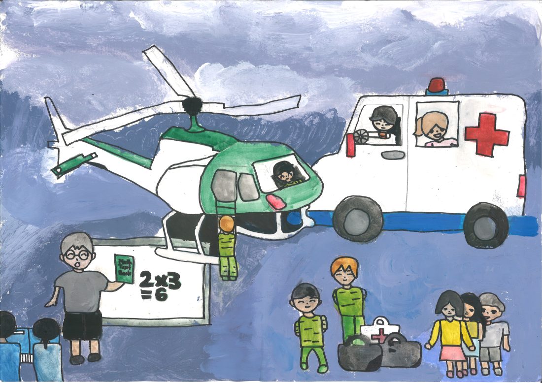 Description: My artwork shows soldiers stepping out of a helicopter, not for battle, but to bring food and clothing to people affected by war. Medics travel across waters with vital supplies, caring for the sick and offering hope. Teachers guide children to the park, teaching them to care for nature and inspiring a love for learning. Together, these scenes represent compassion, healing, and education. My gift to the world is the belief that kindness, care, and knowledge can help rebuild lives and create a brighter future for everyone.