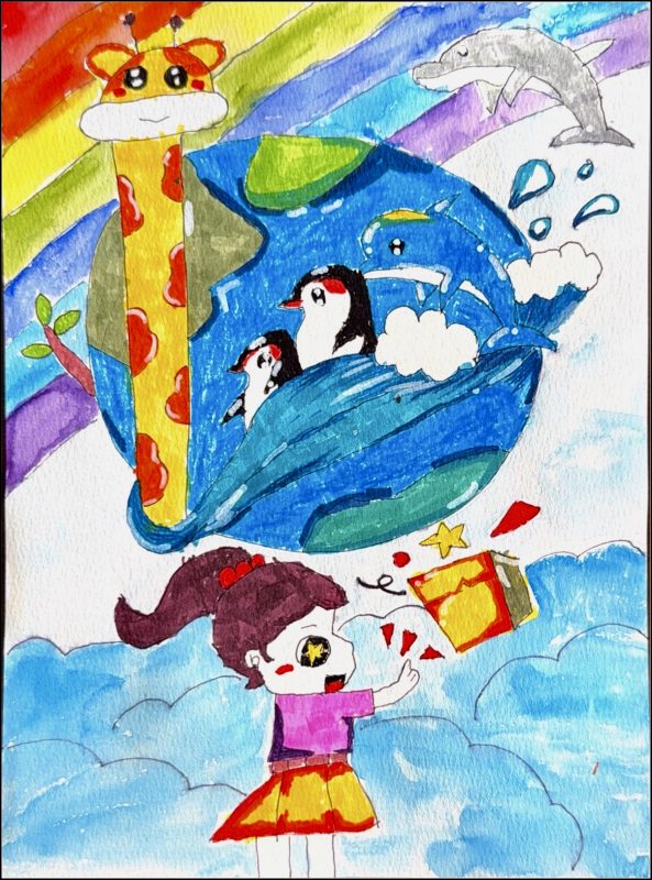 这幅画表达了对地球的热爱与珍视,展现出地球是充满生机与美好的家园,各类生物和谐共处,而人类(以小女孩为代表)也能在这份美好中收获惊喜与欢乐,呼吁大家守护地球,让这份奇幻与美好永远延续。